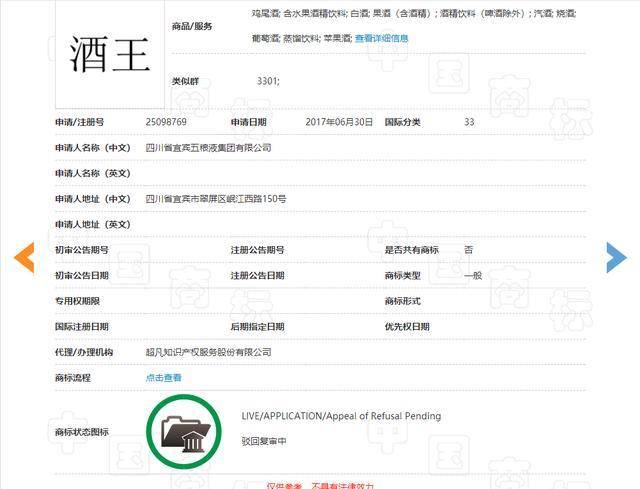 五粮液旗下有一枚“酒王”商标,让其操碎了心,却仍旧没有成功注册。从商标局查询,“酒王”商标是五粮液于2017年6月30日注册的申请号为25098769号,指定使用在鸡尾酒;含水果酒精饮料;白酒;果酒(含酒精);酒精饮料(啤酒除外);汽酒;烧酒;葡萄酒;蒸馏饮料;苹果酒等第33类商标,目前还处于“驳回复审”阶段。