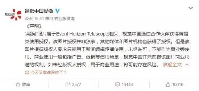 明确黑洞照片属于Event Horizon Telescope (EHT),视觉中国通过合作伙伴获得编辑类使用授权,并非独家授权,但是该图片只能用于新闻编辑传播使用,未经许可不得作为商用,并提出该图片未经版权人授权用于商用可能会存在风险。