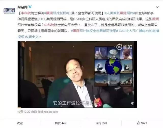 但是..... 还没等大家缓过神来,剧情又出现了大反转,针对“黑洞照片是否有版权”一事,中科院院士武向平又发声解答黑洞版权归属问题:“表示图片一旦发布了,就是全世界可以使用的,媒体上也可以看见,只要标注是哪里来的就可以。”
