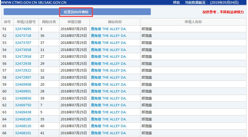 查询发现,“鹿角巷”相关商标最早的注册时间为2017年8月1日,申请人为邱茂庭。当日,邱茂庭申请注册了第25629373号第43类“鹿角巷 THE ALLEY DA”商标,并于2018年12月13日获得初步审定。