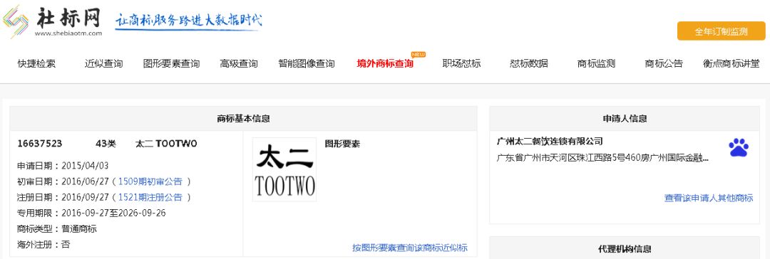 广州太二公司称自己通过商标转让,从广州九毛九餐饮连锁股份有限公司手中购得“太二”商标,商标核定使用在第43类住所代理(旅馆、供膳寄宿处);食物雕刻;餐厅等服务上。
