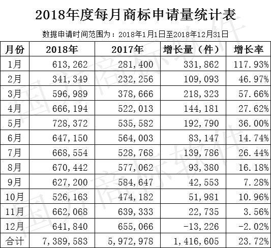 数据显示,2018年,全国商标注册申请量738.95万件,比2017年增加141.66万件,增长率为 23.72%。