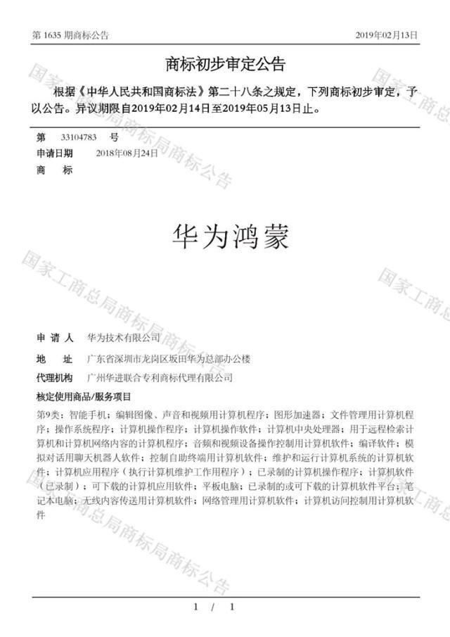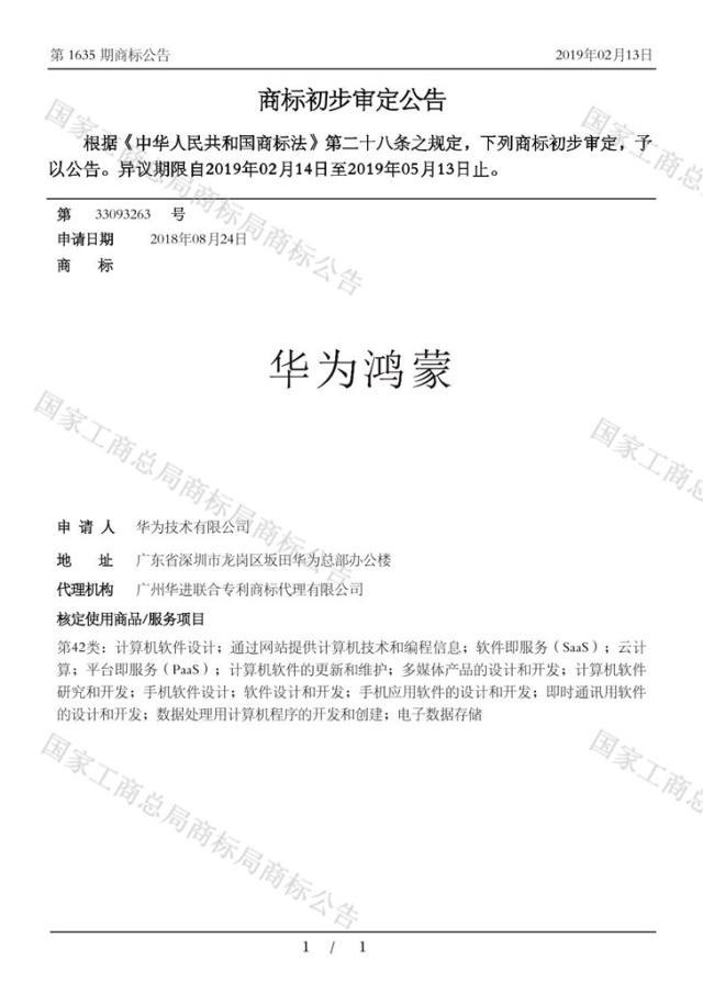 华为公司分别在第9类(科学仪器)和第42类(科学服务)申请注册了“华为鸿蒙”商标,其商标专用权期限为2019年05月14日至2029年05月13日。